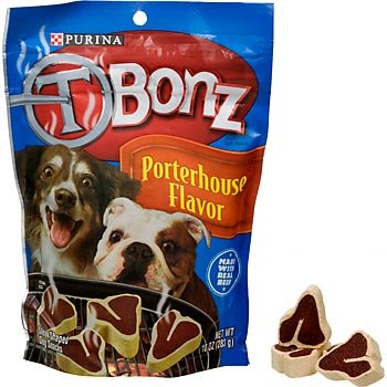 T-Bonz Porterhouse Flavor Chewy Dog SnacksThere's nothing better than steak cooked out on the grill. The sizzle and the great smell make your mouth water! You love the taste of steak and so does your dog - now you can give your dog a great steak experience every day with T Bonz dog snacks!
