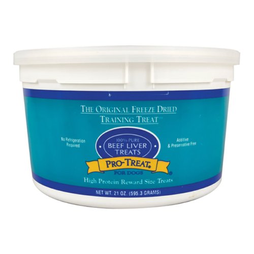Pro-Treat Freeze Dried Liver Treats are 100% pure beef liver. They were developed many years ago as a tool for training pure bred dogs for show, and as an obedience tool for dogs in the ring. Over the years the use of freeze dried treats expanded from professional dog trainers and breeders to pet owners that want a more natural and healthy treat for their pets. 475 pieces in each tub.